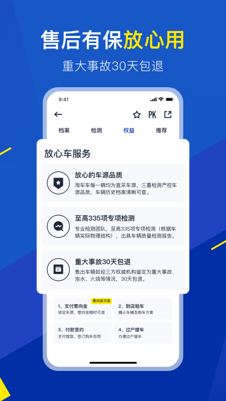「真实车况保障」专业检测团队把关,重大事故车辆支持30天无忧退换。