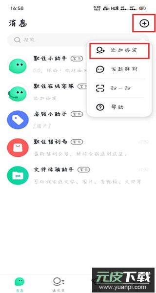 2. 在消息界面点击右上角加号图标,选择添加好友功能入口;