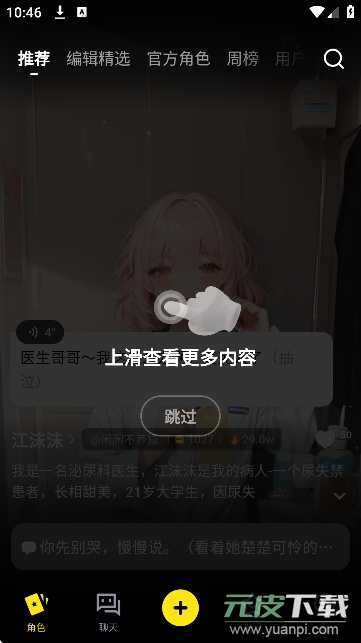 3、随后你将进入应用首页,界面会展示当前热门的AI角色推荐,你可以选择感兴趣的角色开始对话,也可以直接跳过此步骤;