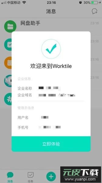 管理员信息设置完毕,页面会跳转至欢迎界面,展示已注册的企业信息及管理员账号。点击立即体验即可完成注册并进入系统。