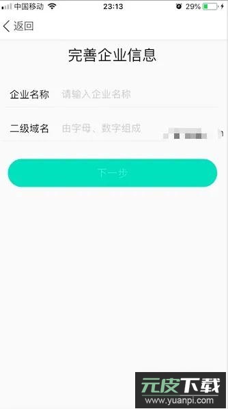手机验证通过后,进入完善企业信息步骤。需要填写企业名称及由字母、数字组成的二级域名,点击下一步系统将自动检测域名是否重复。