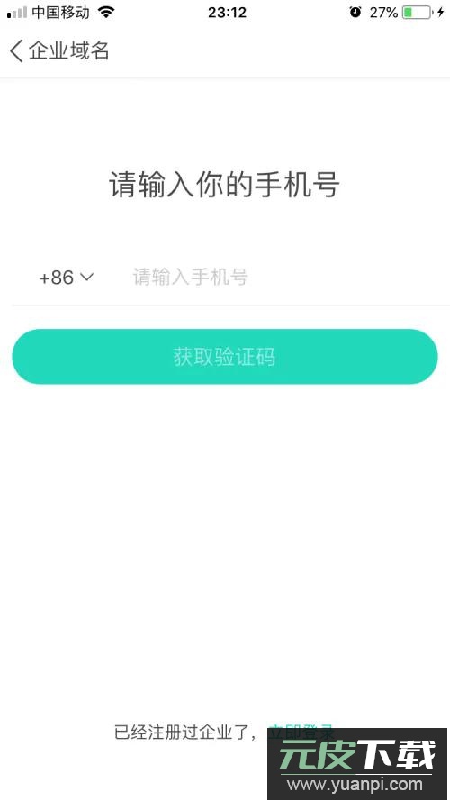 点击创建企业后,首先进入手机号填写页面。支持国内外手机号码,境外用户需在前方选择对应国家代码,例如+86。