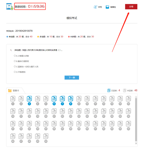 7、点击“交卷”按钮时,若存在未作答题目,系统会提示“还有XX题未做,是否交卷”,用户可选择返回继续答题或确认交卷。确认交卷后,平台将立即显示本次考试成绩与是否合格的结果。