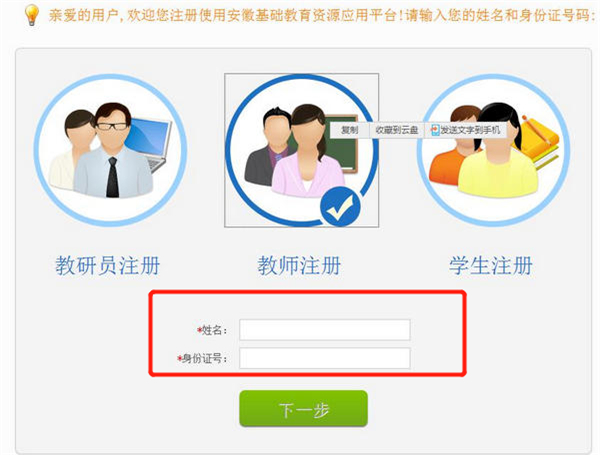 教师注册:输入正确姓名与身份证号码,点击“下一步”,系统将验证用户信息。