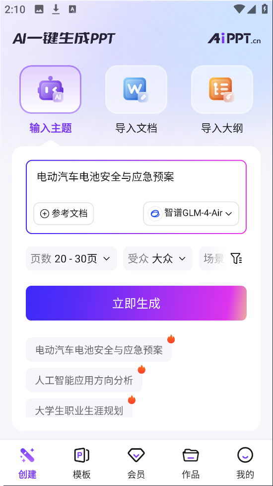 1、打开软件,输入想要制作的PPT主题,输入完成后点击立即生成;