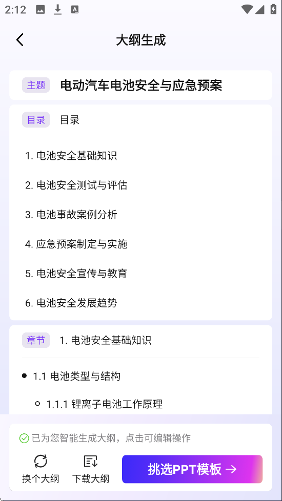 3、大纲生成完成后,用户可选择直接下载大纲,也可继续挑选PPT模板进行排版美化;
