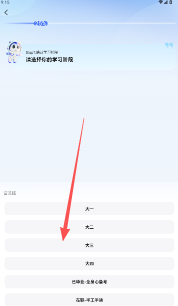 4、接着选择当前学习阶段以及计划考研的时间等信息,请确保每一步都填写完整。