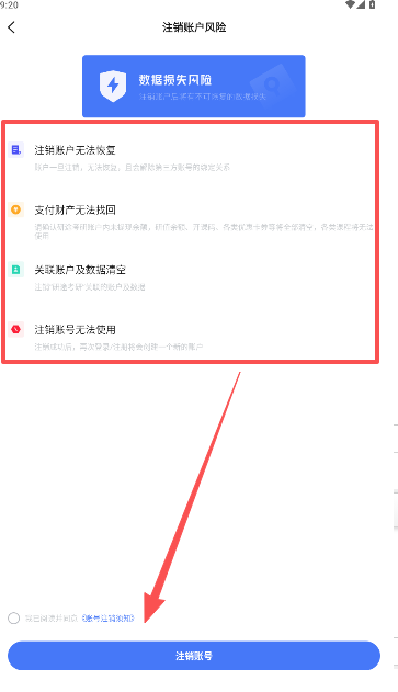 3、仔细阅读注销账户的风险提示,勾选底部的协议说明,即可完成注销操作。