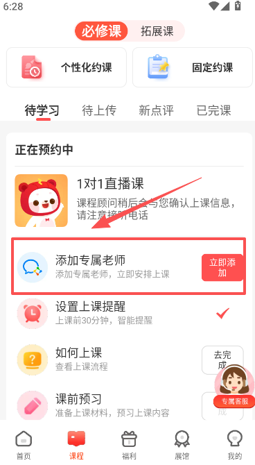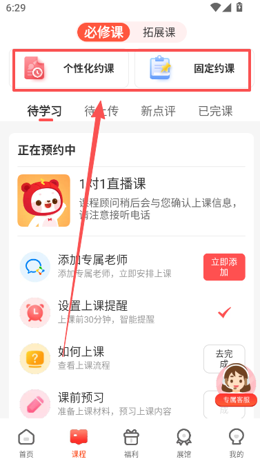 1、在课程页面顶部选择个性化约课或固定约课;