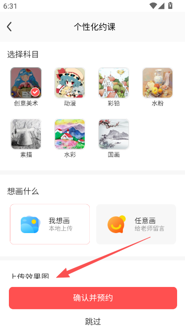 3、在个性化约课界面选择科目,上传本地作品或任意画作效果图,点击确认并预约;
