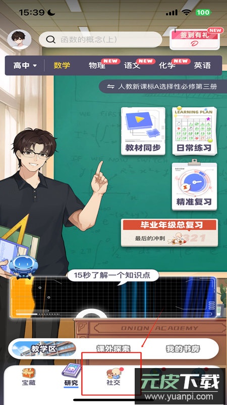 1、打开洋葱学园APP完成登录,点击页面的社交板块
