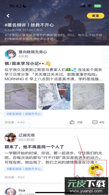 3、进入话题页后点击右下角的参与按钮,就可以和同好互动聊天