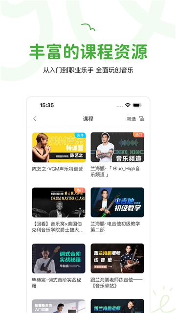 2、教程区提供吉他、键盘、打击乐、声乐等多种乐器与科目的学习内容;