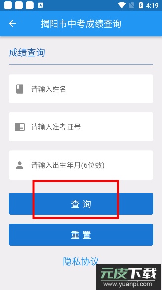 进入应用后,在首页找到中考查询入口,点击进入成绩查询页面;