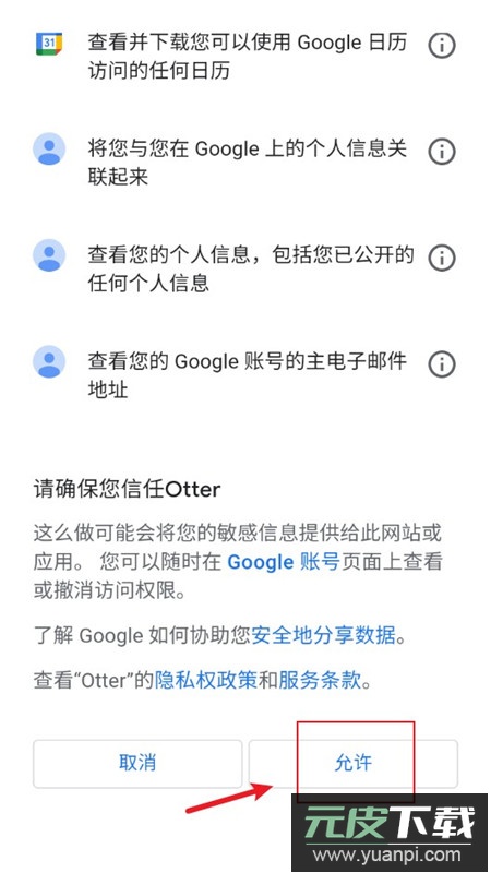 4、界面会弹出Otter请求访问Google账号的提示,滑动到页面最底部,点击“允许”按钮即可;