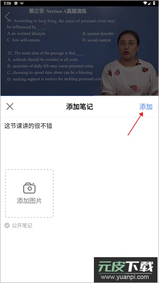 3、在笔记编辑界面,填写文字内容并添加图片;笔记可设置为公开或仅自己可见。编辑完成后,点击右上角“添加”按钮保存笔记。