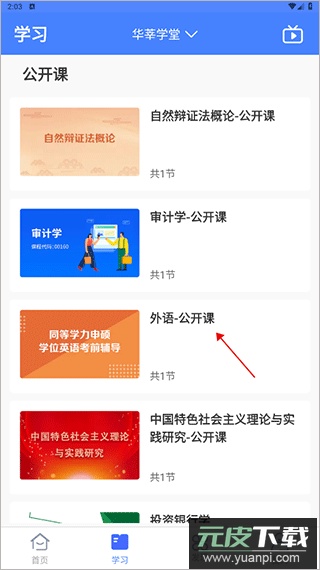 1、首先,打开华莘学堂app完成注册登录,在主页面选择意向学习的课程。