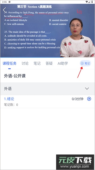 2、进入课程学习界面后,点击视频右下角的“笔记”按钮,即可开始记录学习笔记。