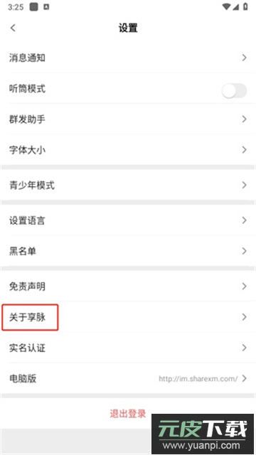 进入设置页面后,会出现免责声明、关于享脉、实名认证及电脑版等选项,请选择【关于享脉】进入下一步。