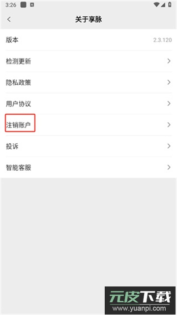 随后在关于享脉的界面中,提供检测更新、注销账户与投诉等功能,直接点击【注销账户】进行操作。