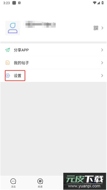 然后在个人页面中,可以看到分享应用、我的帖子及设置等功能入口,此时需要点击【设置】按钮。