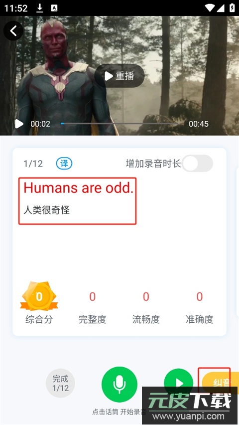 4. 若单句得分不理想,可点击纠音查看音节评分并重新尝试;