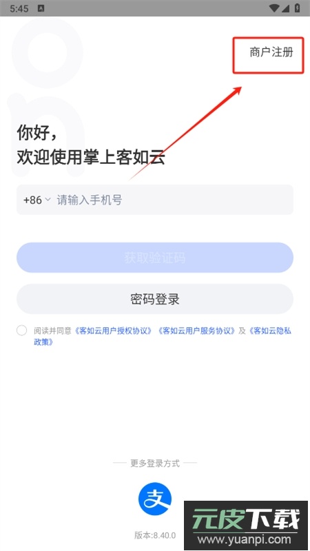 下载安装应用后,启动进入登录界面,点击商户注册选项。