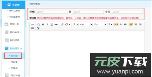 4、提问功能:观看视频时可直接提问,也可通过“我的提问”菜单发起;提问前需选择对应的课程、章节及小节,问题内容需与所选课程相关,否则视为无效。