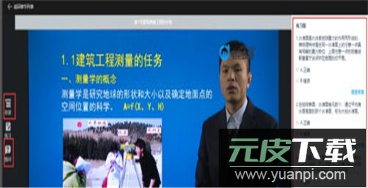 3、视频播放:播放界面左侧为课程章节目录,可自由切换小节;右侧显示该小节对应的五道练习题;遇到疑难可点击提问按钮寻求帮助。