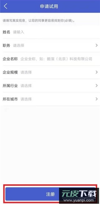 3、提交企业名称,行业分类和所属城市等信息,申请试用。