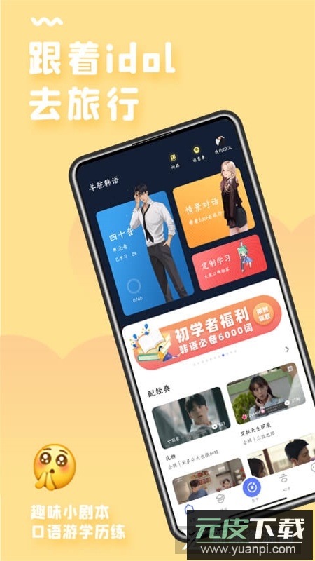 韩语四十音部分完整覆盖元音、辅音、拼读及音变,通过听说读写结合练习测试,实现全面记忆与巩固;情景对话小剧本支持跟读功能,鼓励用户开口练习,并借助AI发音测评优化口语;韩语配音板块持续更新韩剧、综艺及歌曲素材,用户可在经典片段中模仿跟读,提升语言实际运用能力。