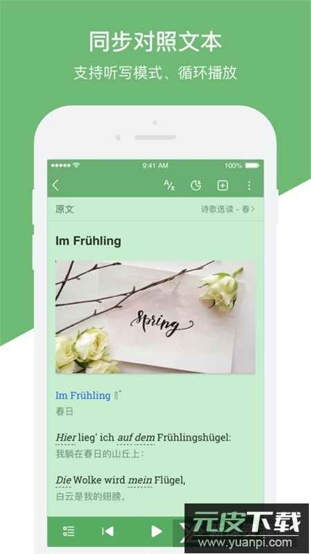 它具备每日更新的庞大听力资源库,并配备了独特的智能语音高亮跟随技术