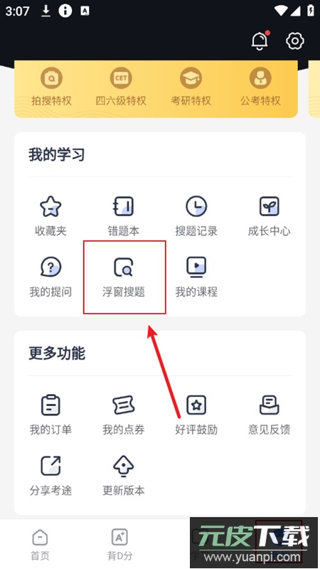 2. 进入个人中心页面,点击悬浮窗搜题入口。