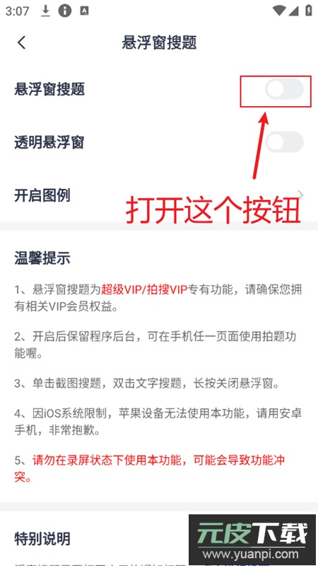 3. 在悬浮窗搜题界面,开启右侧的功能开关。