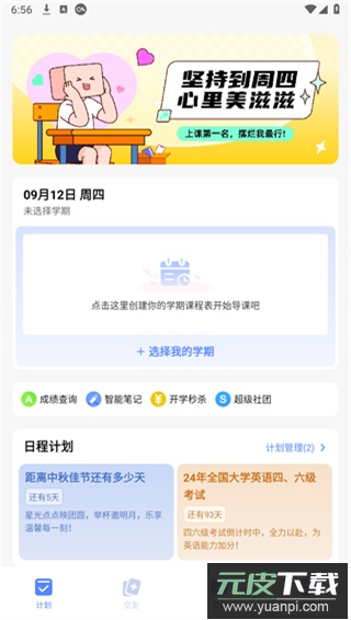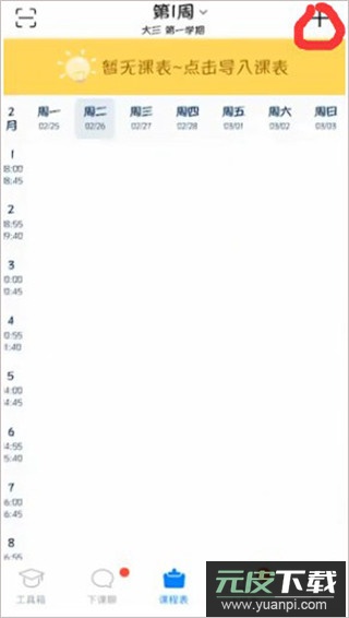1、进入超级课程表app,切换到课程表页面,点击右上角的“+”号选择导入课程;