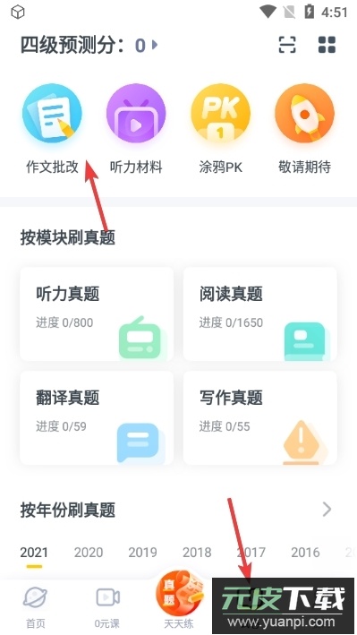 1、在试卷练习页面,找到作文批改的入口;