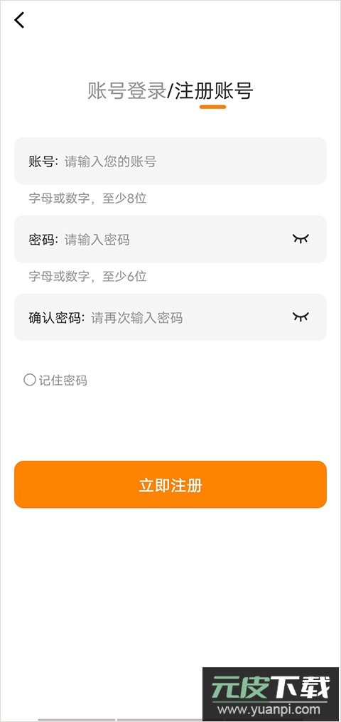 在登录页面选择“注册账号”,随后输入账号与密码即可完成注册流程。