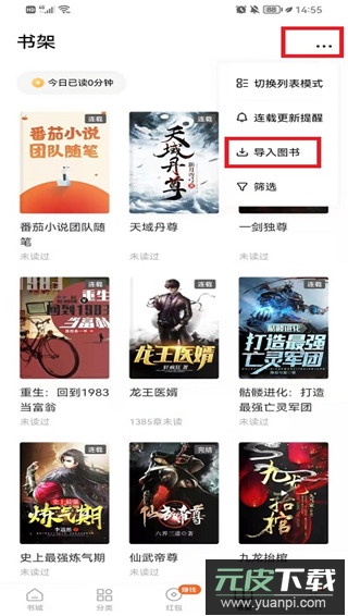 2、在书架界面点击右上角的更多图标,在弹出的菜单中选择“导入图书”功能;