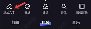 2、导入视频素材,点击包装里的【添加文字】