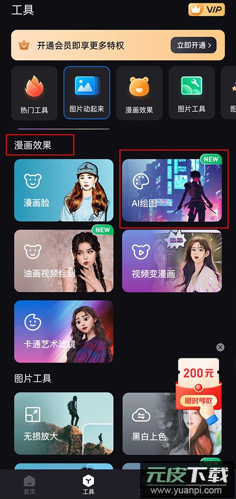 随后在功能区内找到“漫画效果”并点击其中的“AI绘画”选项;