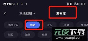 2、页面跳转后,点击底部“素材库”,在弹出的选项中选择“转场”。