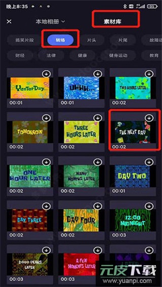 3、进入转场素材界面,浏览并挑选一个合适的转场效果或贴图。