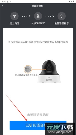 5. 启动设备并听到语音提示后,点击界面中的“已听到”按钮;