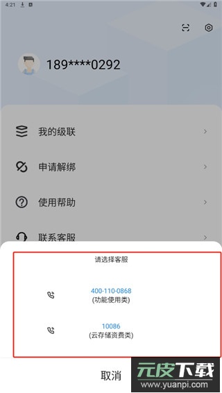 3. 返回“我的”页面,点击联系客服也可查看客服联系电话。