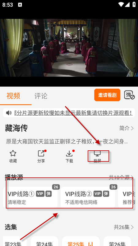 3、点击影片封面进入播放页面,选择合适的播放源,点击全屏按钮后,点击屏幕下方的倍速图标,可选择0.5X到3.0X之间的任意倍速; 4、播放页点击投屏按钮,连接同一WiFi下的电视设备,就能将视频投到大屏观看;