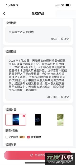 4、进入作品生成页面,可对视频进行最终编辑并选择封面;编辑完成后点击生成作品按钮。