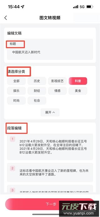 3、可对文章进行分类,并对标题与段落进行修改,编辑完成后点击下一步。