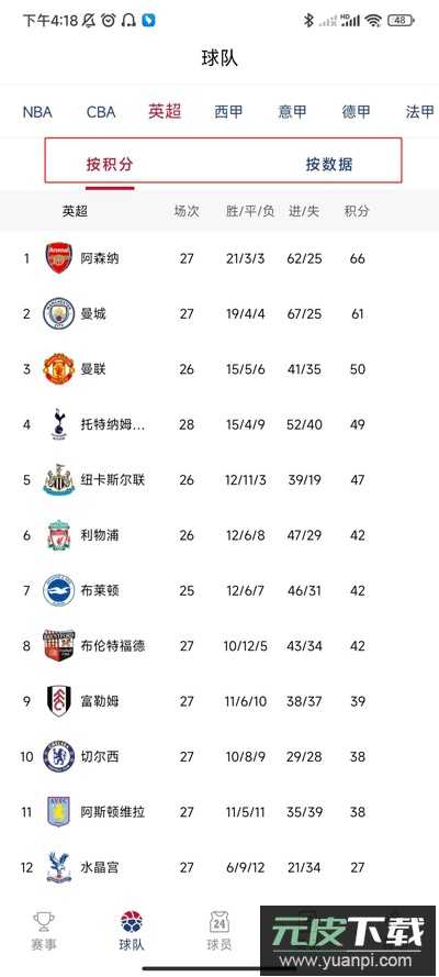 3、点击球队查看喜爱队伍的排行,支持积分或数据排行切换;