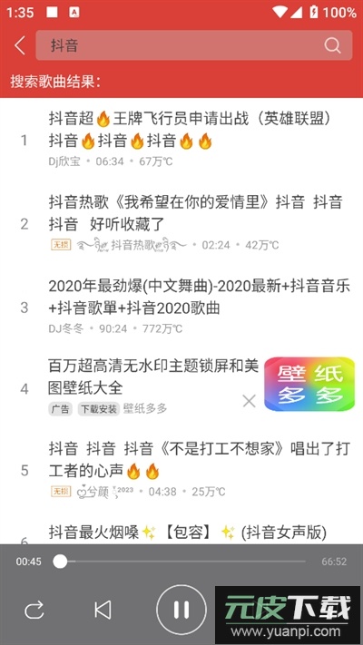 4、在搜索框内输入“抖音”,即可浏览并选择平台上各种热门的抖音DJ音乐。