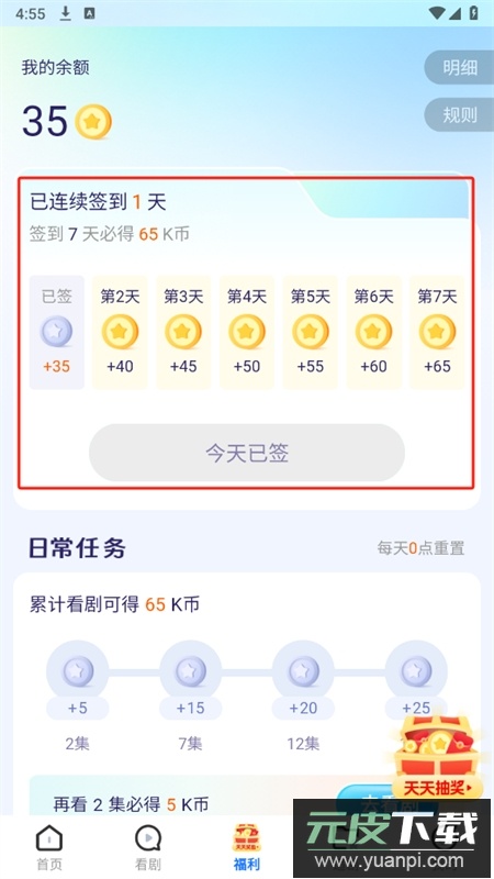4、进入福利中心页面,可以通过每日签到、完成指定任务等方式获取更多金币奖励。